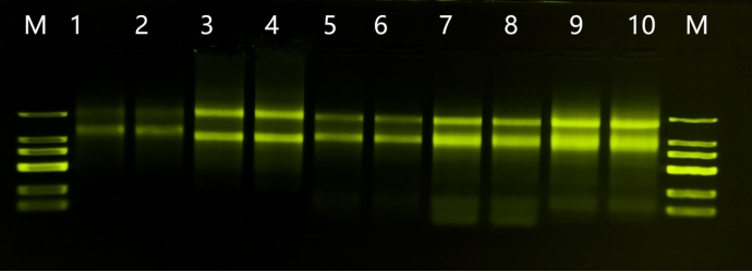 The A260/A280 ratio was between 1.8-2.0, while the A260/A230 ratio exceeded 1.4, indicating high purity of the extracted products. All plant leaf samples achieved nucleic acid extraction yields above 9 µg. Bright and well-integrated bands were observed in all plant leaf samples. In summary, the extraction process yielded high-purity products with substantial output and complete electrophoretic bands when processing different plant leaf samples.