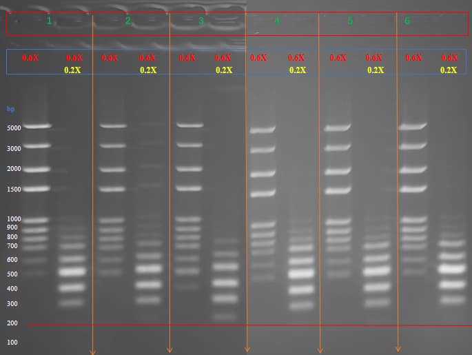 The results show that in the first round of 0.6X purification, the foreign A beads, 220011, 220021, 220022 and 220022′ were sorted above 500bp, while 220012 was sorted up to 400bp; from the second round of 0.2X separation, the foreign A beads, 220021, 220022 and 220022′ were mainly sorted 300-500bp, among which 220011 had a little residue due to the large fragment and needed to be further optimised, while 220012 needed to be further optimised due to the sensitivity of 220011 to pH. ‘s main sorting 300-500bp, of which 220011 has a little residue due to the large bands, probably due to 220011 is more sensitive to pH needs to be further optimised, while 220012 due to the first round of the recovery is higher can be appropriately adjusted the concentration of salt ions and PEG or adjust the sorting volume ratio to 0.55X + 0.2X to achieve the the same sorting effect.