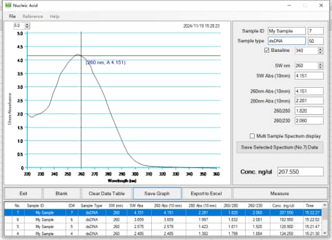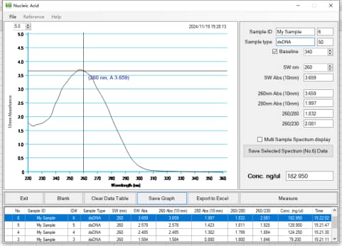 - The sample is DH 5α E. coli (containing PHY300PLK-egls gene plasmid, base pair about 6000 bp, low copy plasmid), bacterial solution OD600 = 0.032. Plasmid was extracted by LJbio192H fully automated nucleic acid extraction and purification instrument. After extraction was determined by Quawell Q5000 trace ultraviolet visible spectrophotometer, the results are as follows: