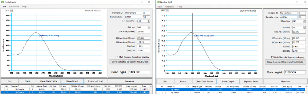 (1) The sample is DH 5α E. coli (containing PHY300PLK-egls gene plasmid, base pair about 6000 bp, low copy plasmid), bacterial solution OD600 = 0.239. Plasmid was extracted by LJbio32H automated nucleic acid extraction instrument (combined with the instrument operation, the amplitude was level 3). After extraction was determined by Quawell Q5000 trace ultraviolet visible spectrophotometer, the results are as follows: