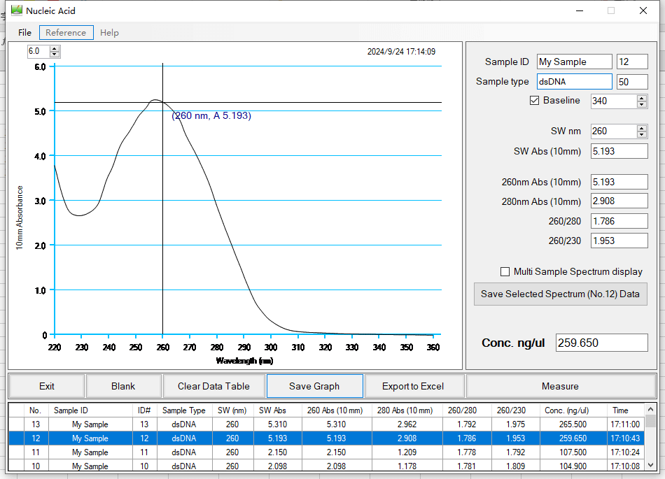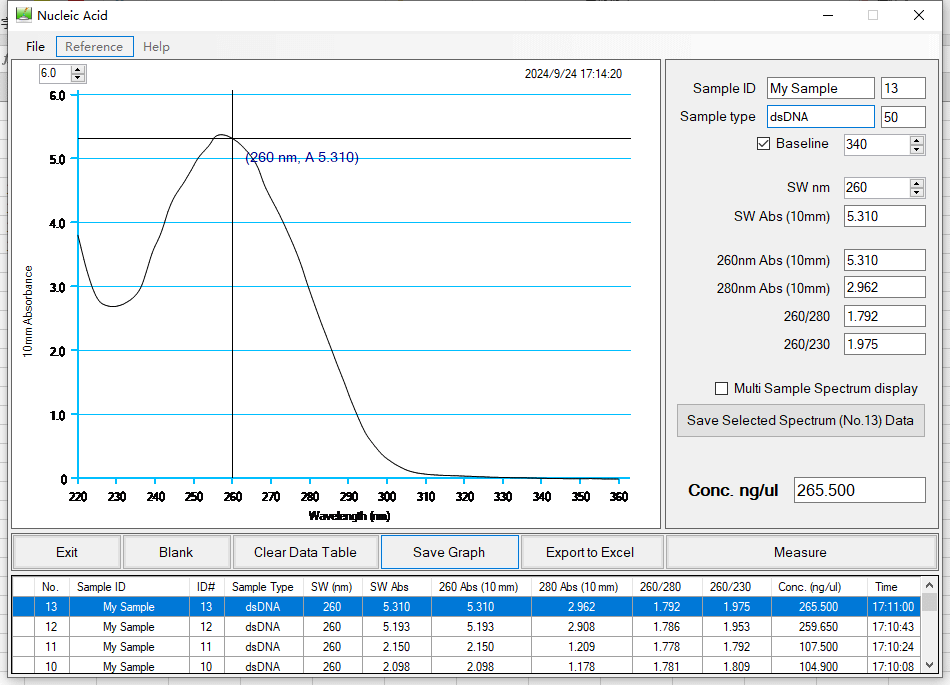 (1) The sample is DH 5α E. coli (containing PHY300PLK-egls gene plasmid, base pair about 6000 bp, low copy plasmid), bacterial solution OD600 = 0.11. After extraction was determined by Quawell Q5000 trace ultraviolet visible spectrophotometer, the results are as follows: