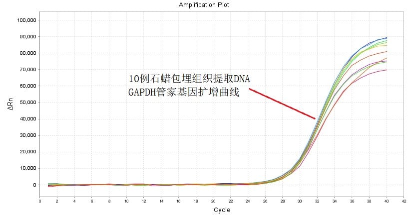 The DNA of 10 cases of paraffin-embedded tissues (5 μm, 6 sections) of human gastric mucosa was extracted by using our company’s paraffin-embedded tissue DNA extraction kit, and then qPCR was performed with human GAPDH housekeeper gene as the target gene, and whether the extracted product affected qPCR amplification.