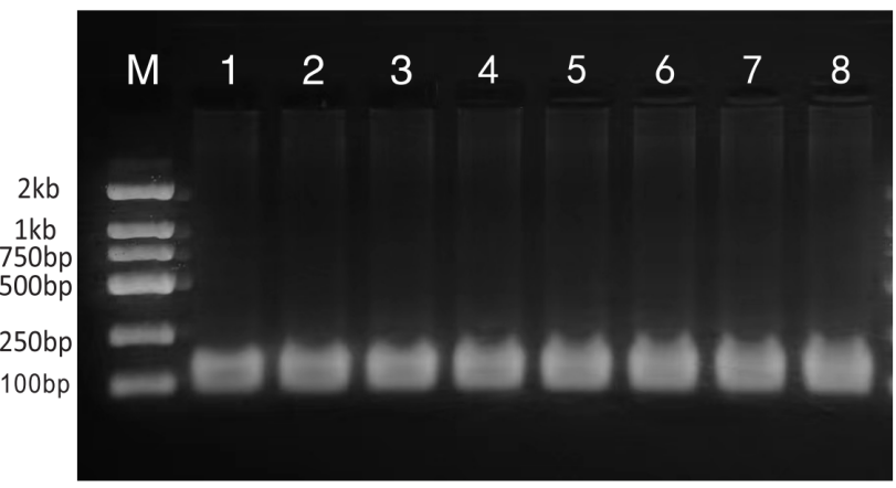 The electrophoresis results were as follows, sample starting volume: 200 μL, 80 μL elution, 6 μL top sample electrophoresis, agarose gel concentration of 1%, 120 V, electrophoresis for 30 min.